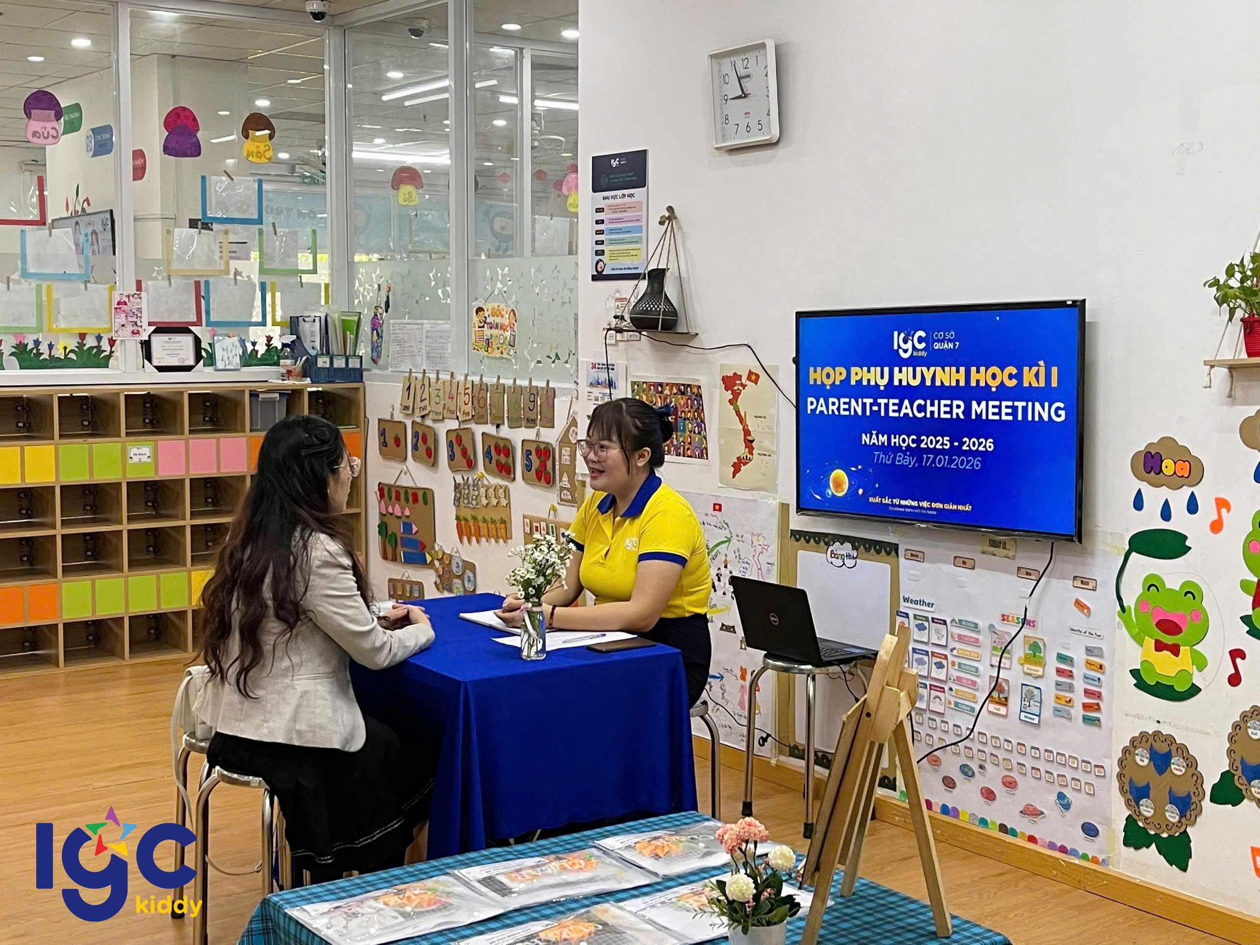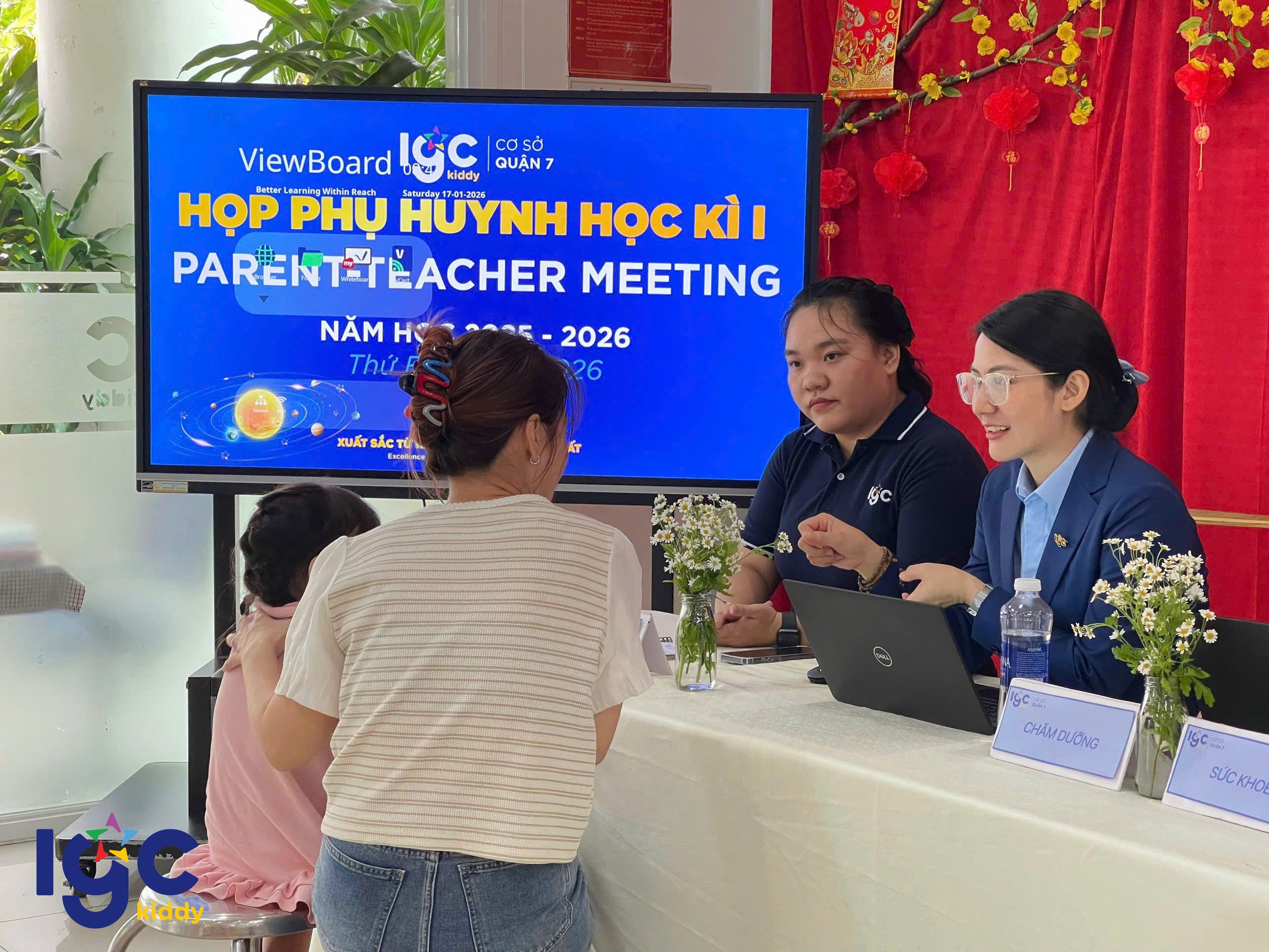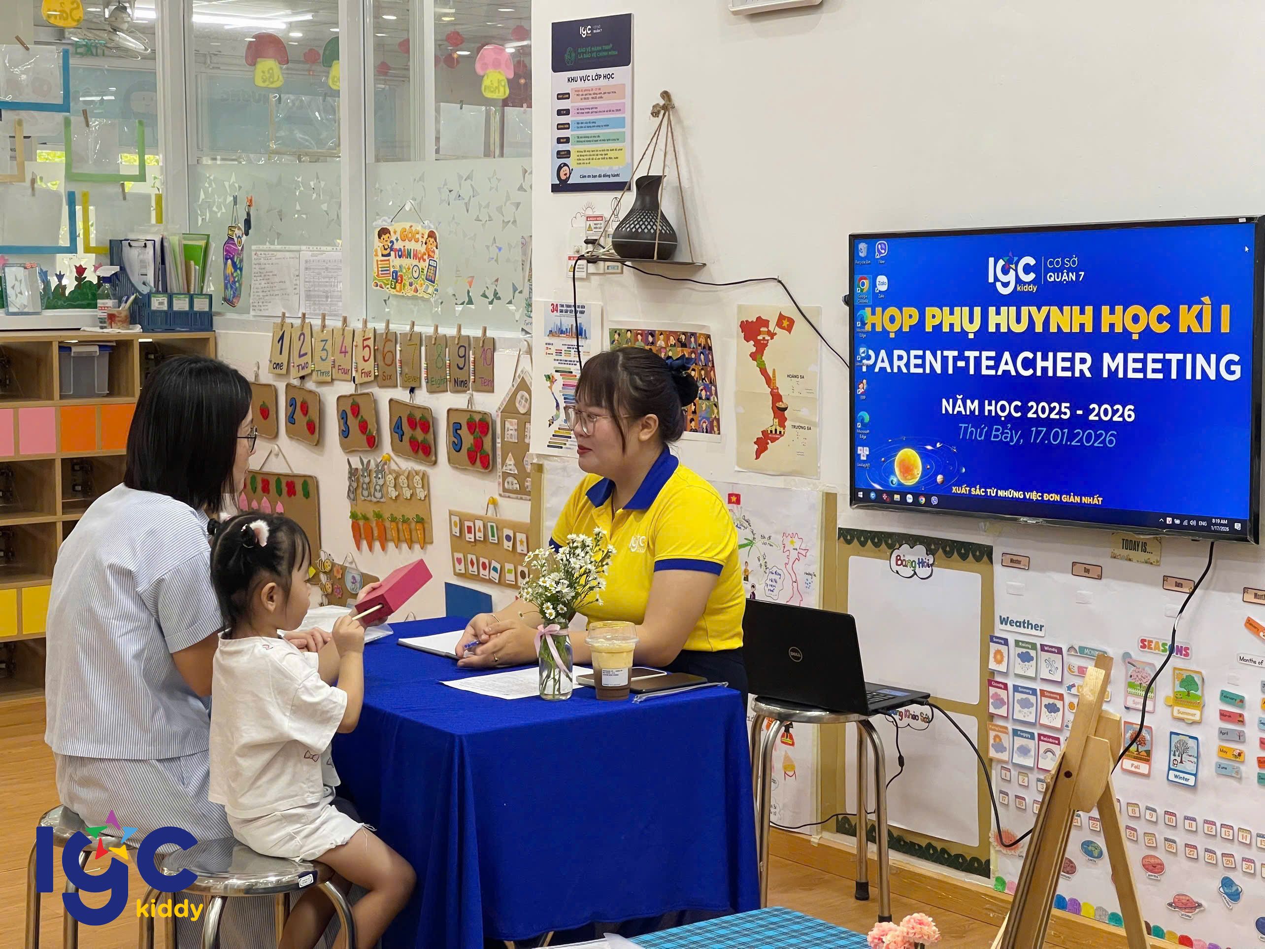 Trường IGC Kiddy – Cơ sở Quận 7 xin trân trọng cảm ơn Quý Cha Mẹ Học Sinh đã dành thời gian quý báu đến tham dự buổi họp Phụ huynh Học sinh Học kỳ I vừa qua 💙 Buổi họp không chỉ là dịp để Giáo viên chủ nhiệm chia sẻ cụ thể về quá trình học tập – rèn luyện – sự tiến bộ của từng con, mà còn là cơ hội để nhà trường lắng nghe những chia sẻ, mong muốn từ phía Phụ huynh, giải đáp chi tiết các thắc mắc, giúp ba mẹ thêm an tâm khi gửi gắm con yêu tại IGC Kiddy Quận 7 🌱 Nhà trường rất trân trọng những ý kiến đóng góp, chia sẻ chân thành từ Quý Phụ huynh. Đây chính là nguồn động lực để tập thể IGC Kiddy Quận 7 không ngừng hoàn thiện chất lượng chăm sóc – giáo dục, mang đến cho các con một môi trường học tập an toàn, hạnh phúc và giàu trải nghiệm. 🤝 Bên cạnh đó, việc Cha Mẹ trực tiếp gặp gỡ Ban Giám hiệu, Quản lý Chương trình Tiếng Anh, Giáo viên nước ngoài và các thầy cô bộ môn đã góp phần tăng cường sự kết nối – minh bạch – đồng hành giữa nhà trường và gia đình. IGC Kiddy Quận 7 tin rằng, với sự đồng hành và phối hợp chặt chẽ từ Quý Phụ huynh, các con sẽ tiếp tục tự tin – tiến bộ – hạnh phúc và có thêm nhiều trải nghiệm thú vị hơn nữa trong học kỳ II sắp tới. Một lần nữa, Nhà trường xin chân thành cảm ơn sự tin tưởng và đồng hành của Quý Cha Mẹ 💙 Hẹn gặp lại gia đình mình trong những hoạt động tiếp theo của nhà trường!