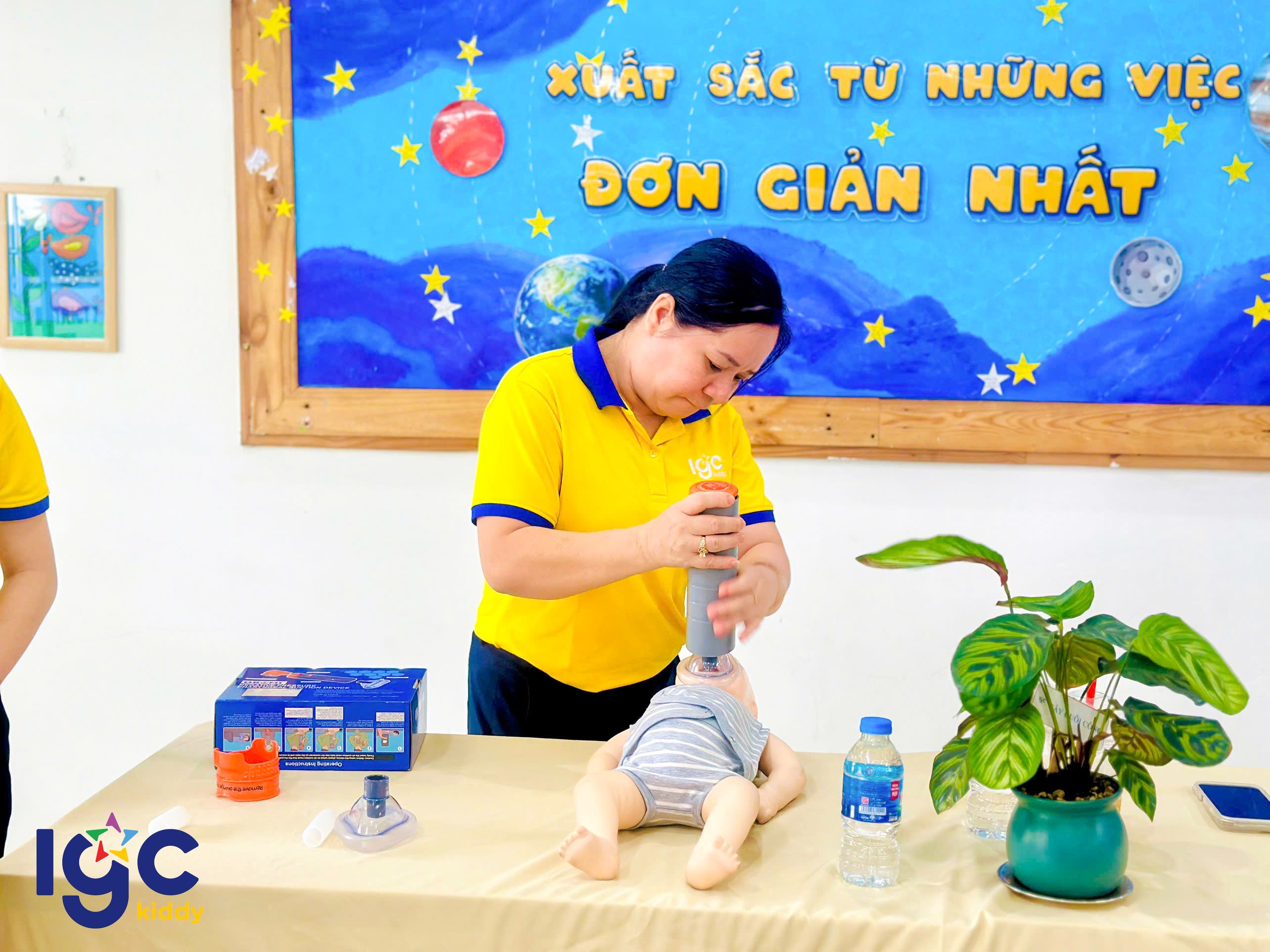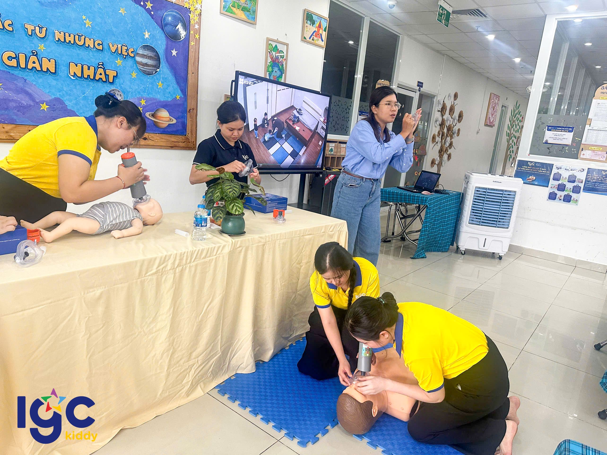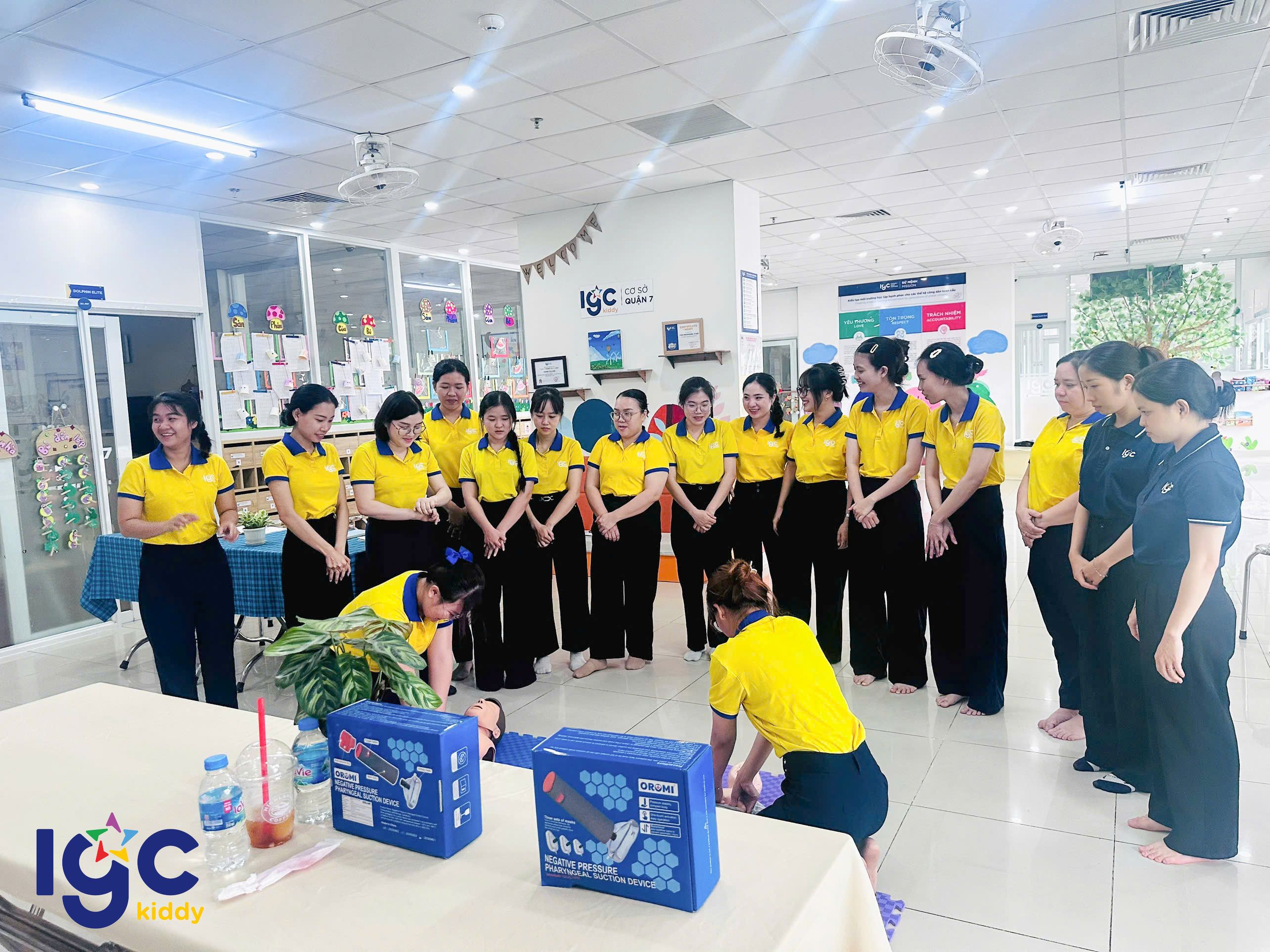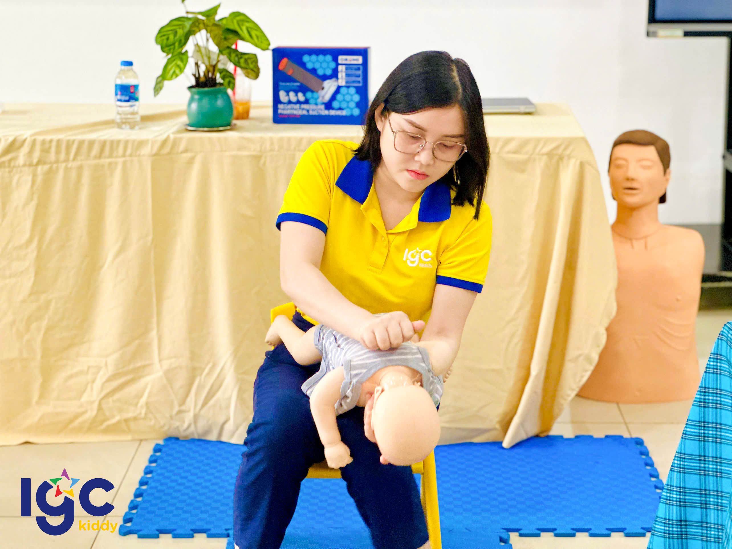 Nhằm giúp đội ngũ giáo viên chủ động và tự tin hơn trong mọi tình huống, nhà trường đã tổ chức buổi tập huấn sơ cấp cứu đầy ý nghĩa. Trong buổi tập huấn, các cô giáo được hướng dẫn thực hành các kỹ thuật sơ cứu cơ bản như: hô hấp nhân tạo, băng bó vết thương, xử lý khi trẻ hóc dị vật, ngất xỉu hoặc chấn thương nhẹ dưới sự hướng dẫn tận tình của chuyên gia. Đặc biệt, chương trình còn được trang bị, hỗ trợ và hướng dẫn sử dụng các thiết bị sơ cấp cứu hiện đại, giúp nâng cao hiệu quả xử lý và tăng khả năng hồi phục cho nạn nhân trong tình huống khẩn cấp. Thông qua buổi tập huấn, các cô không chỉ được trang bị thêm kiến thức y tế thực tế, mà còn rèn luyện tinh thần bình tĩnh, phản xạ nhanh khi chăm sóc và bảo vệ các con yêu. IGC Kiddy Quận 7 luôn chú trọng đào tạo đội ngũ giáo viên thông qua những khóa học kỹ năng cần thiết, đảm bảo môi trường học tập an toàn tuyệt đối yêu thương trọn vẹn cho các bé mỗi ngày.