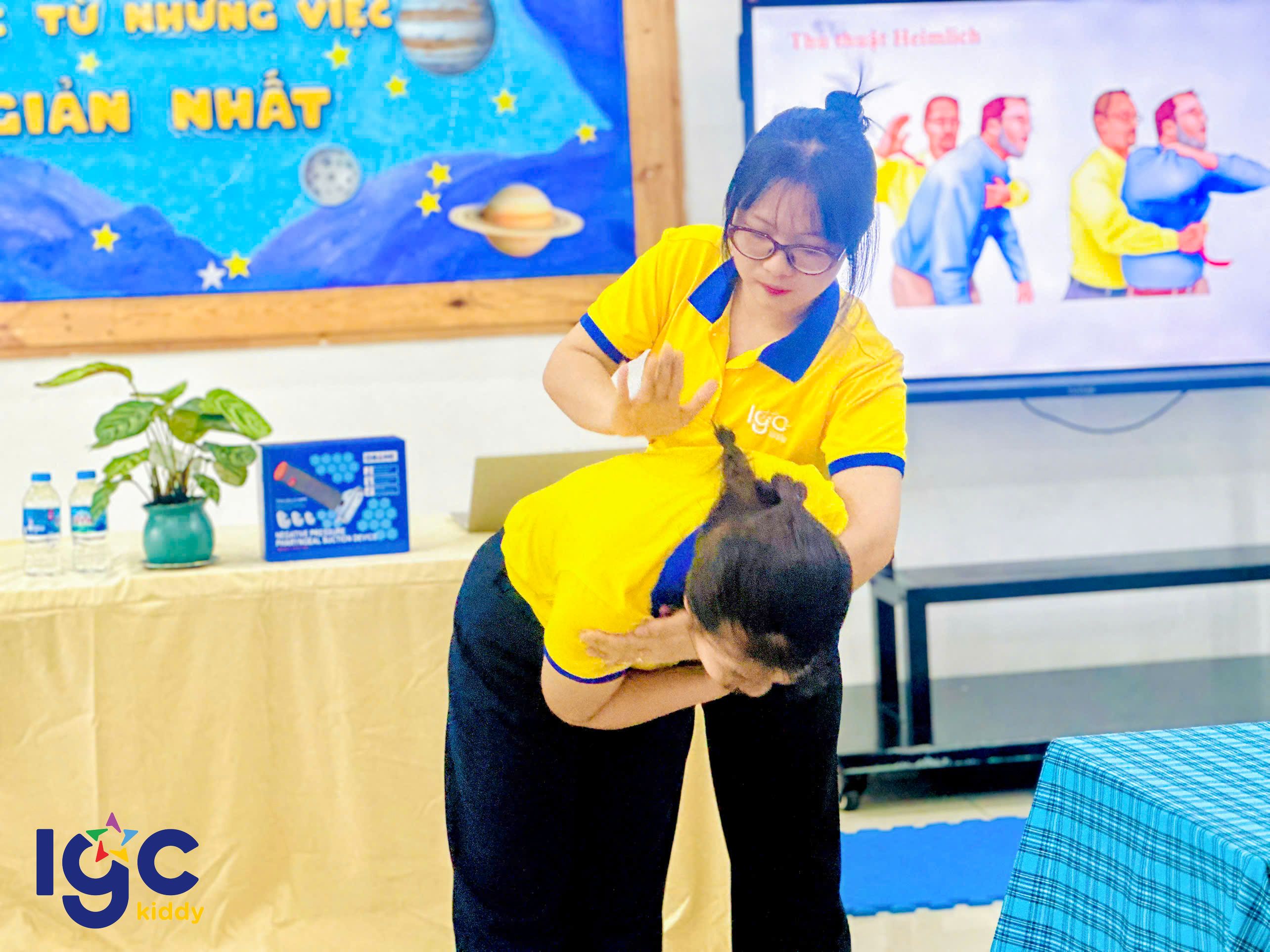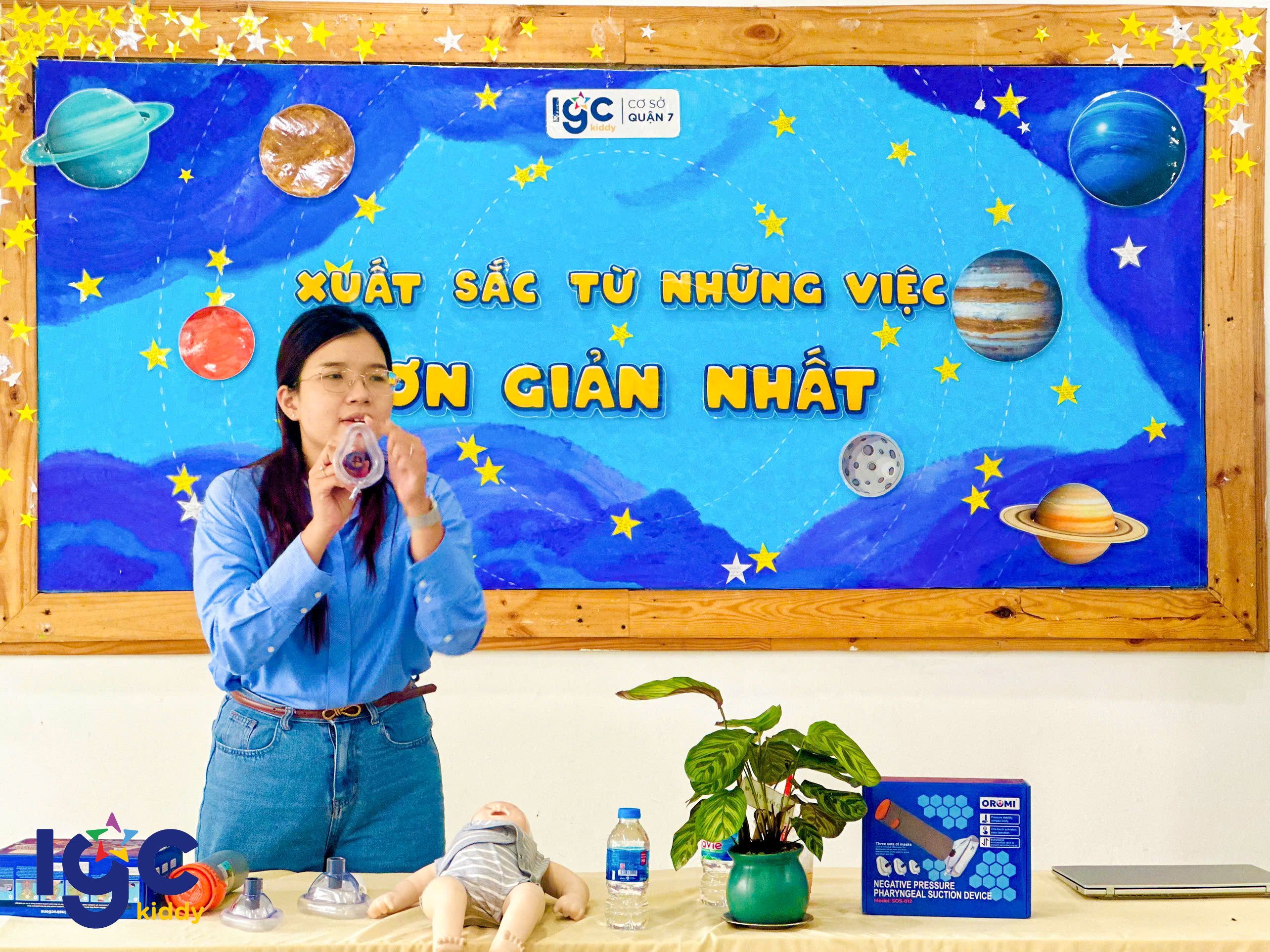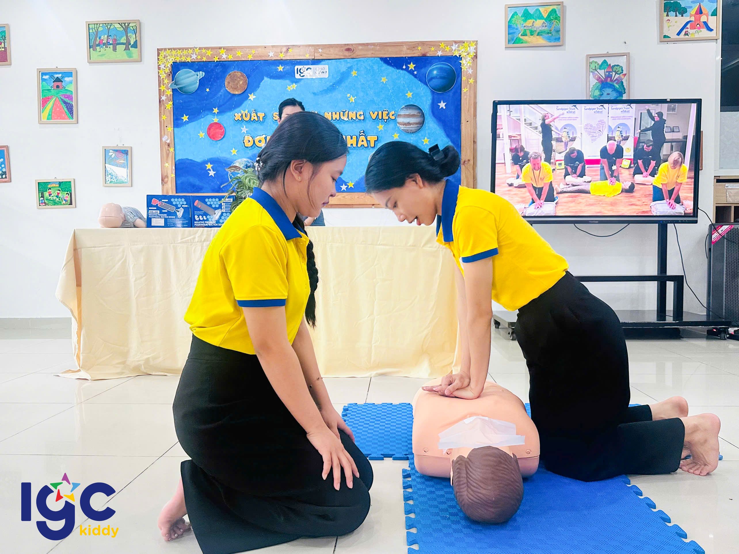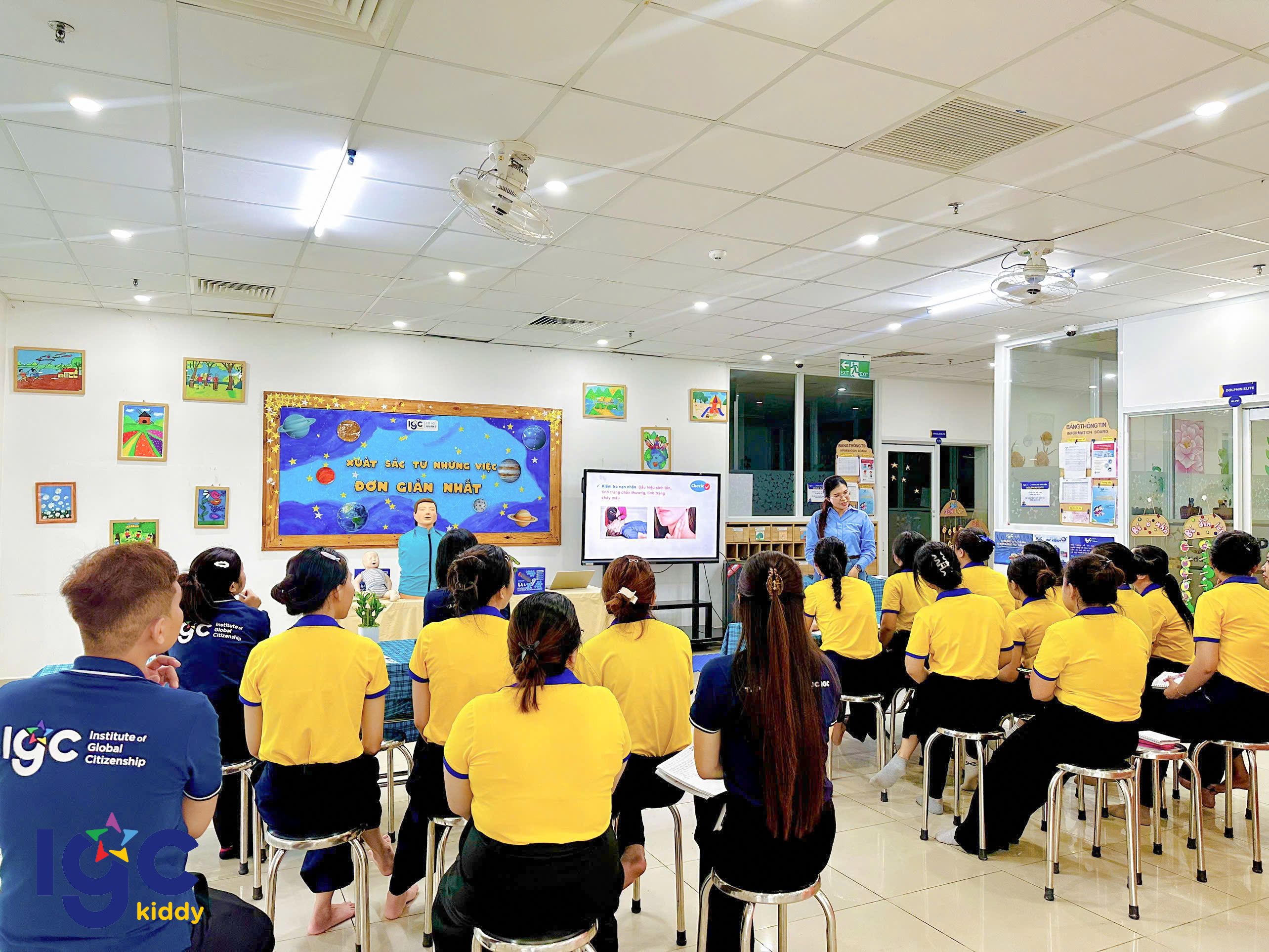 Nhằm giúp đội ngũ giáo viên chủ động và tự tin hơn trong mọi tình huống, nhà trường đã tổ chức buổi tập huấn sơ cấp cứu đầy ý nghĩa. Trong buổi tập huấn, các cô giáo được hướng dẫn thực hành các kỹ thuật sơ cứu cơ bản như: hô hấp nhân tạo, băng bó vết thương, xử lý khi trẻ hóc dị vật, ngất xỉu hoặc chấn thương nhẹ dưới sự hướng dẫn tận tình của chuyên gia. Đặc biệt, chương trình còn được trang bị, hỗ trợ và hướng dẫn sử dụng các thiết bị sơ cấp cứu hiện đại, giúp nâng cao hiệu quả xử lý và tăng khả năng hồi phục cho nạn nhân trong tình huống khẩn cấp. Thông qua buổi tập huấn, các cô không chỉ được trang bị thêm kiến thức y tế thực tế, mà còn rèn luyện tinh thần bình tĩnh, phản xạ nhanh khi chăm sóc và bảo vệ các con yêu. IGC Kiddy Quận 7 luôn chú trọng đào tạo đội ngũ giáo viên thông qua những khóa học kỹ năng cần thiết, đảm bảo môi trường học tập an toàn tuyệt đối yêu thương trọn vẹn cho các bé mỗi ngày.
