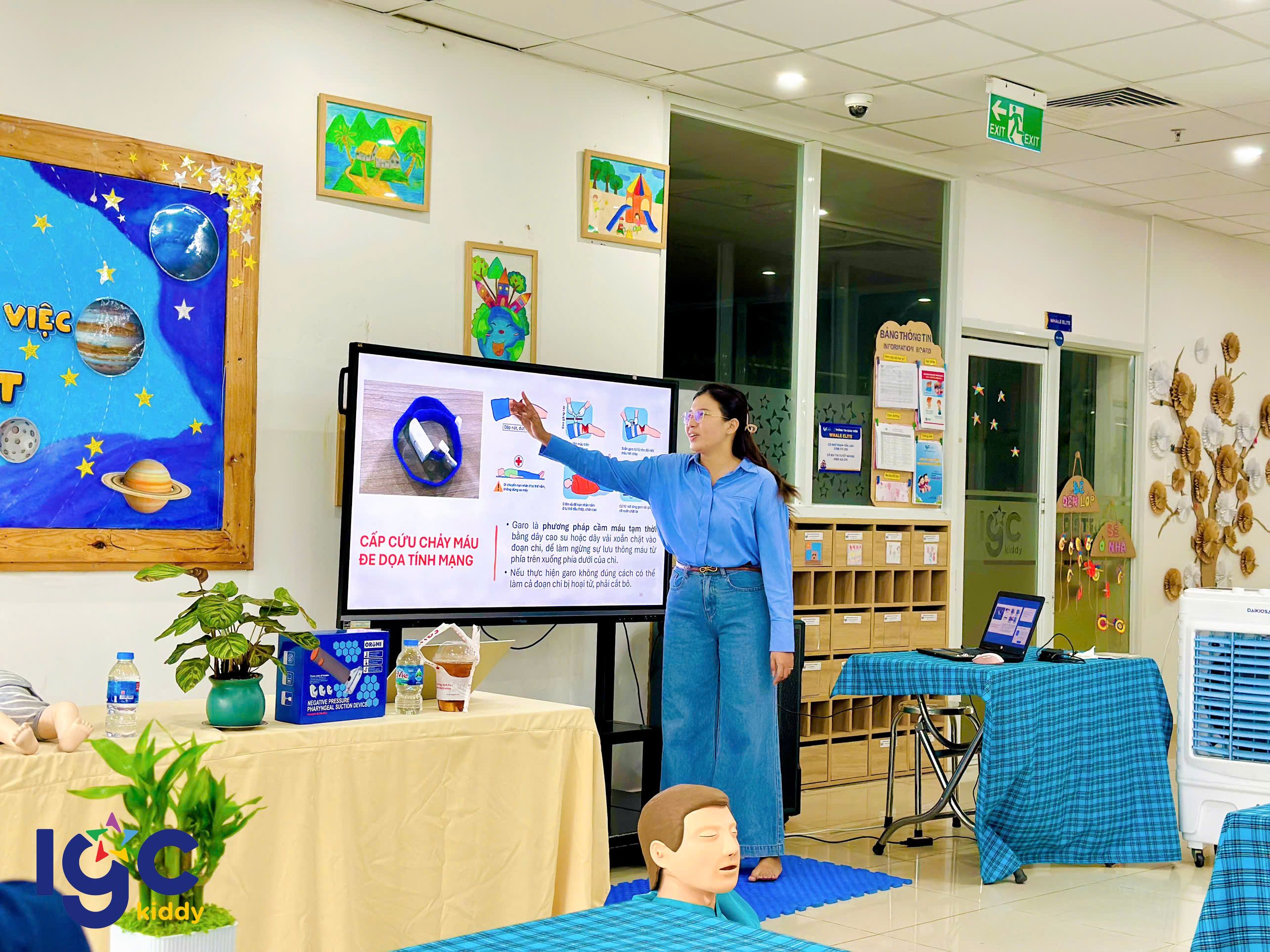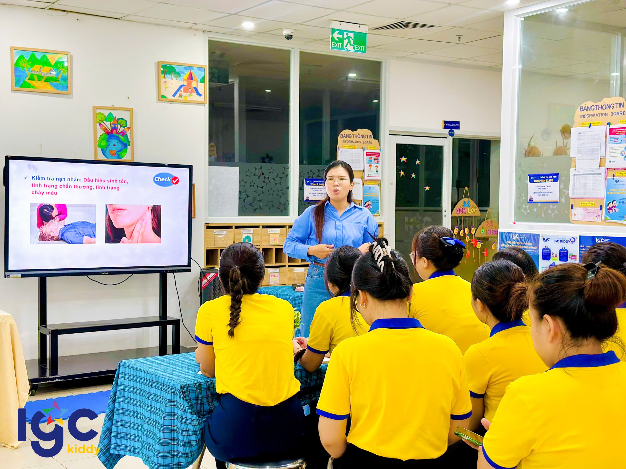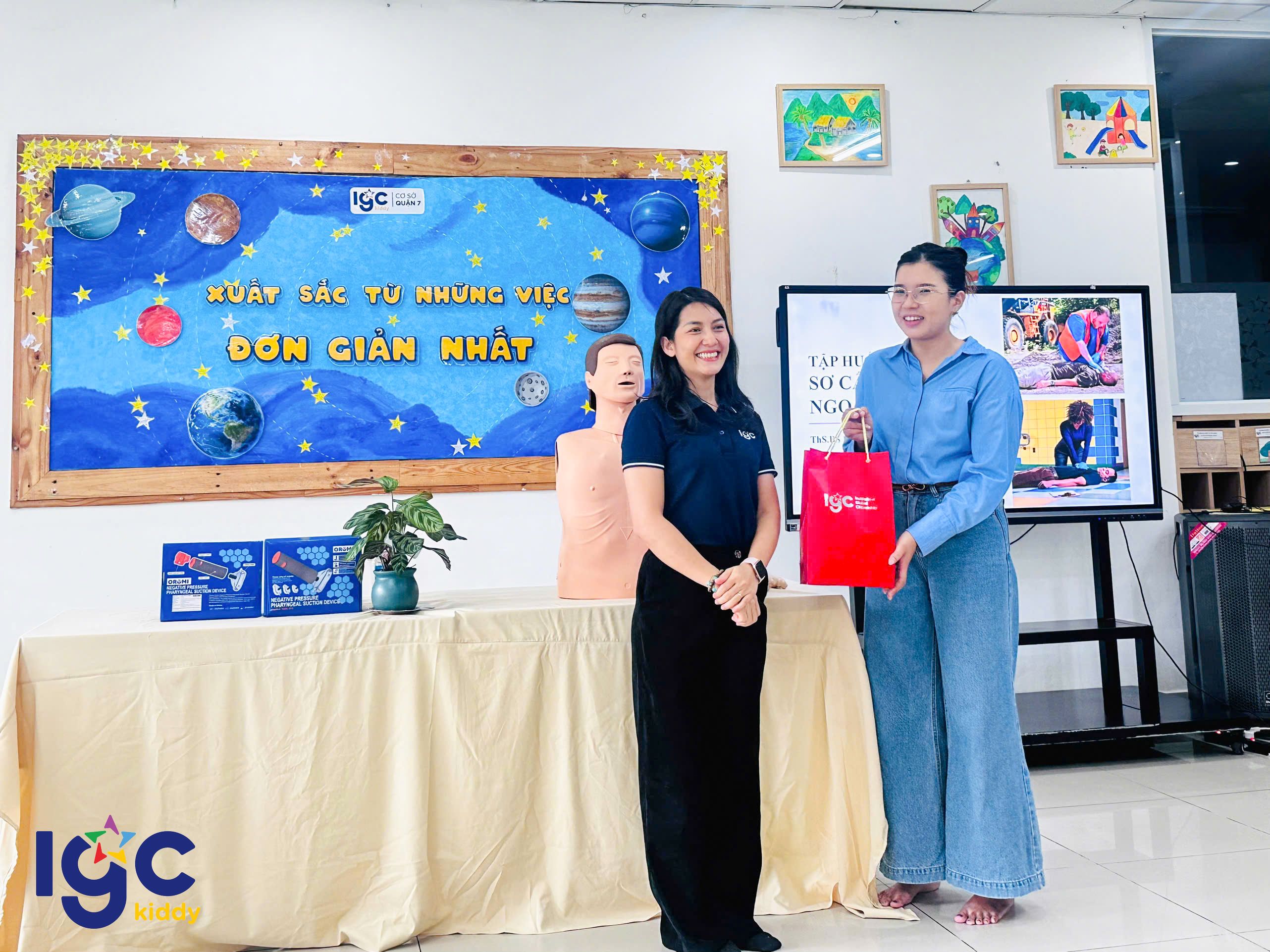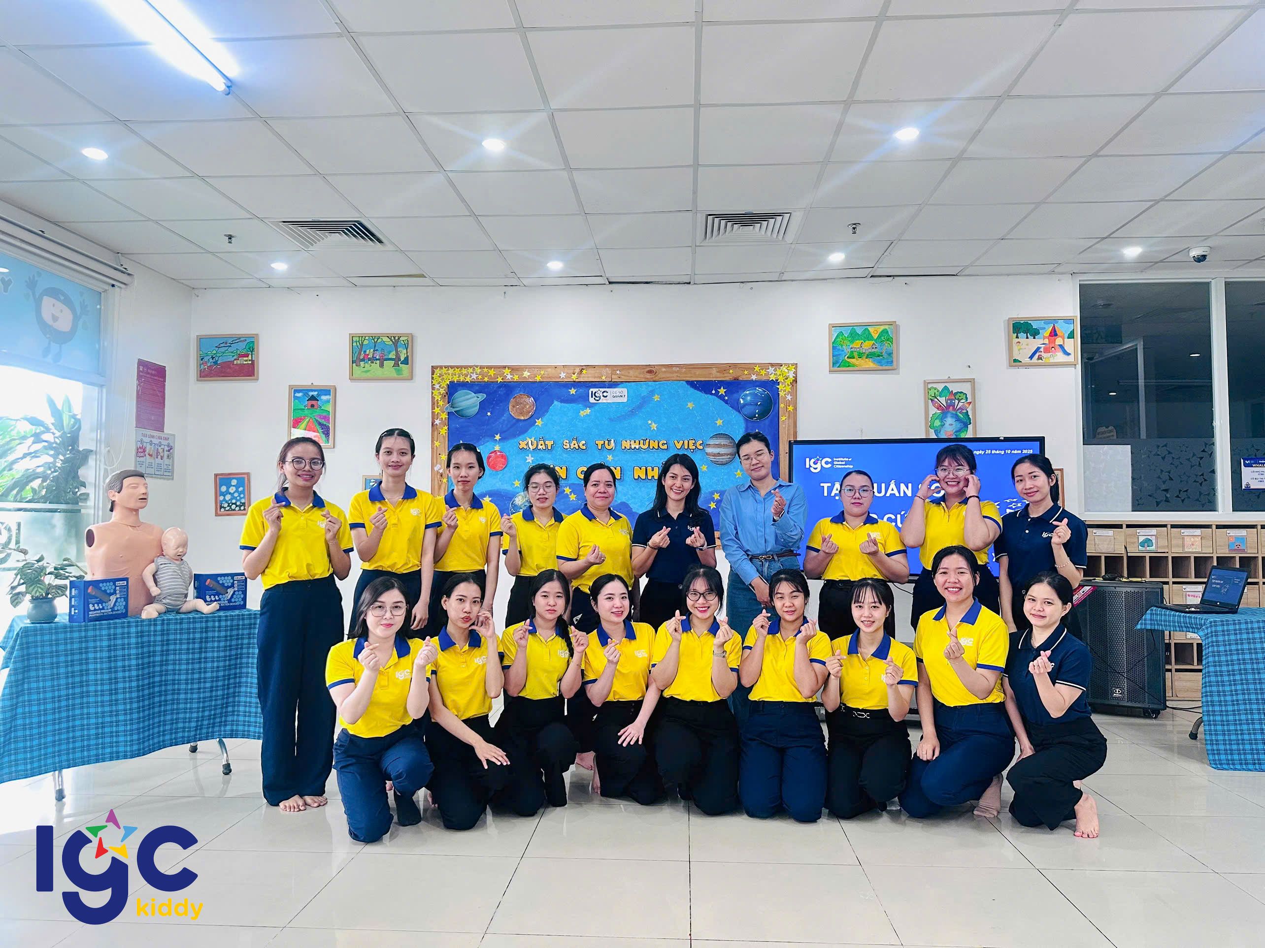 Nhằm giúp đội ngũ giáo viên chủ động và tự tin hơn trong mọi tình huống, nhà trường đã tổ chức buổi tập huấn sơ cấp cứu đầy ý nghĩa. Trong buổi tập huấn, các cô giáo được hướng dẫn thực hành các kỹ thuật sơ cứu cơ bản như: hô hấp nhân tạo, băng bó vết thương, xử lý khi trẻ hóc dị vật, ngất xỉu hoặc chấn thương nhẹ dưới sự hướng dẫn tận tình của chuyên gia. Đặc biệt, chương trình còn được trang bị, hỗ trợ và hướng dẫn sử dụng các thiết bị sơ cấp cứu hiện đại, giúp nâng cao hiệu quả xử lý và tăng khả năng hồi phục cho nạn nhân trong tình huống khẩn cấp. Thông qua buổi tập huấn, các cô không chỉ được trang bị thêm kiến thức y tế thực tế, mà còn rèn luyện tinh thần bình tĩnh, phản xạ nhanh khi chăm sóc và bảo vệ các con yêu. IGC Kiddy Quận 7 luôn chú trọng đào tạo đội ngũ giáo viên thông qua những khóa học kỹ năng cần thiết, đảm bảo môi trường học tập an toàn tuyệt đối yêu thương trọn vẹn cho các bé mỗi ngày.
