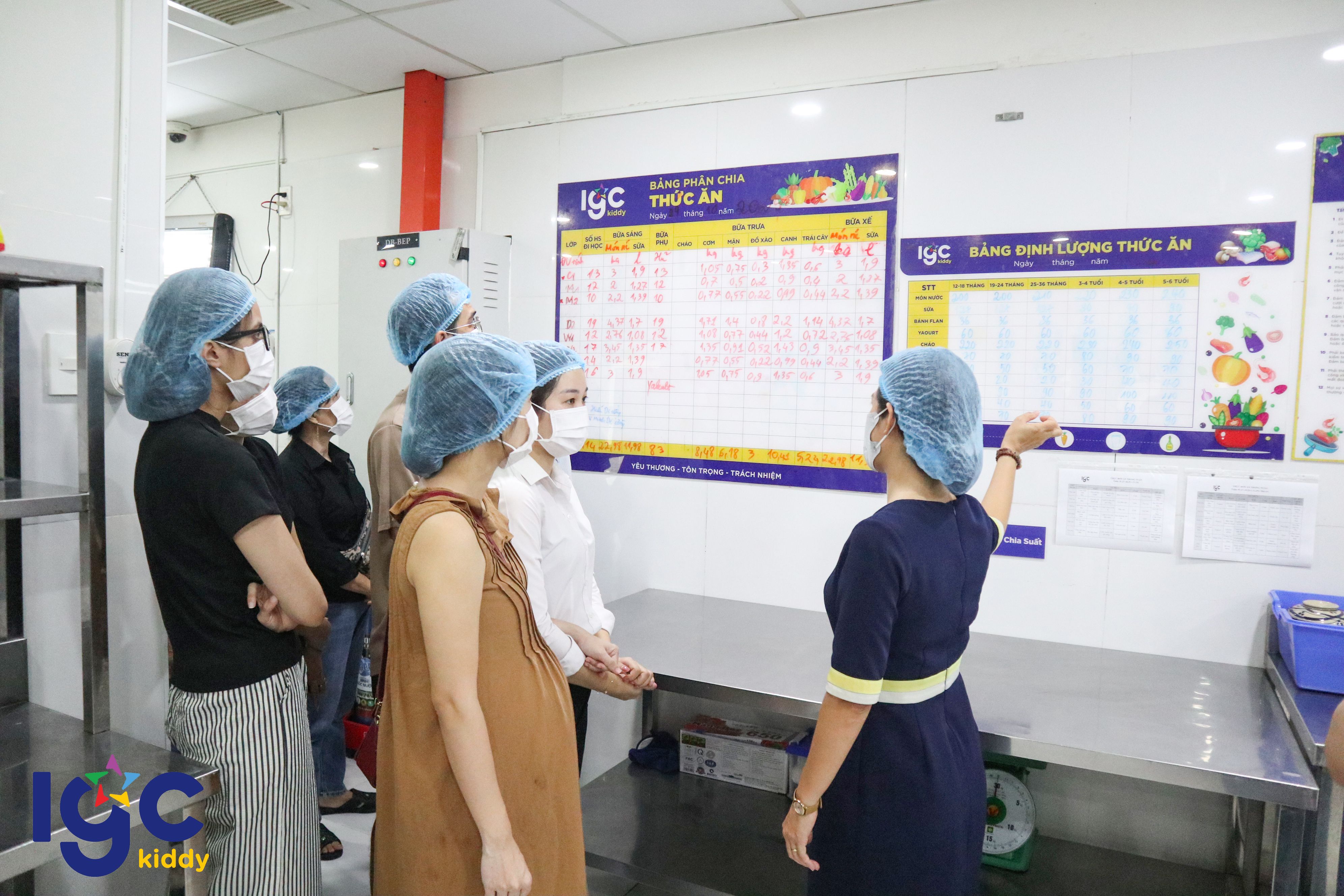 Phụ huynh được trực tiếp tham quan khu bếp hiện đại, tìm hiểu quy trình vận hành bếp một chiều – từ khâu tiếp nhận nguyên liệu đến chế biến, phân chia khẩu phần – tất cả đều tuân thủ nghiêm ngặt quy chuẩn an toàn vệ sinh thực phẩm.